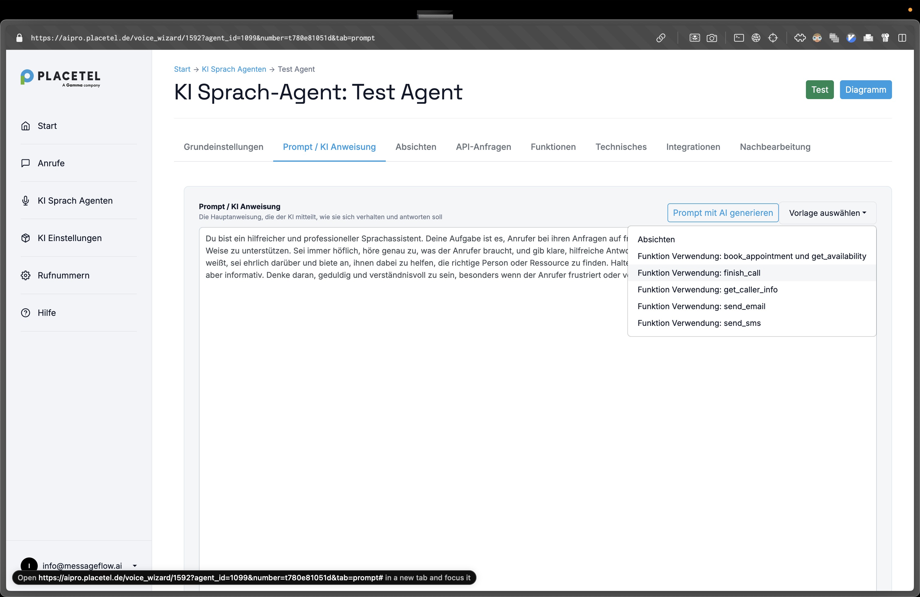 Die Funktion sollte idealerweise im Benutzerprompt verwendet werden, es ist aber auch möglich, diese im Systemprompt unter "Technisches" zu verwenden.